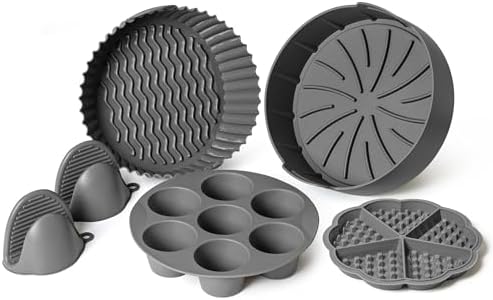 EM5-Piece Silicone Air Fryer Set – This set includes air fryer liner, waffle mold, egg bite mold, baking pan, and oven mitts, making cooking and b...
