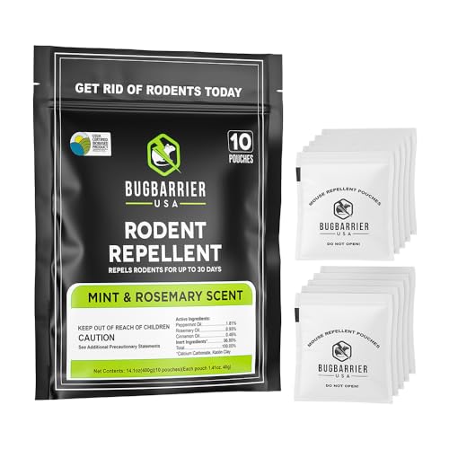View full detailsBugBarrier's Extra-Strength Mouse Repellent Pouches, USDA 99% Biobased, Peppermint & Rosemary Oils Repel Mice Nesting & Freshen Air in Car, RV, Boat, Garage, Shed, Cabin Made in The USA (Pack of 10)