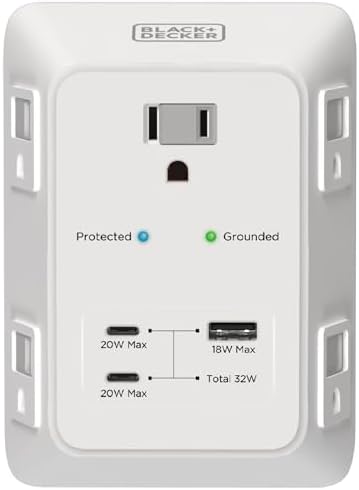 View full detailsBLACK+DECKER PD USB Wall Charger Surge Protector 5 Outlet Extender with 2 USB C PD & 1 USB Charging Ports, Fast Charge 3 Sided Power Strip Multi Plug Outlets Wall Adapter for Home Office ETL Listed