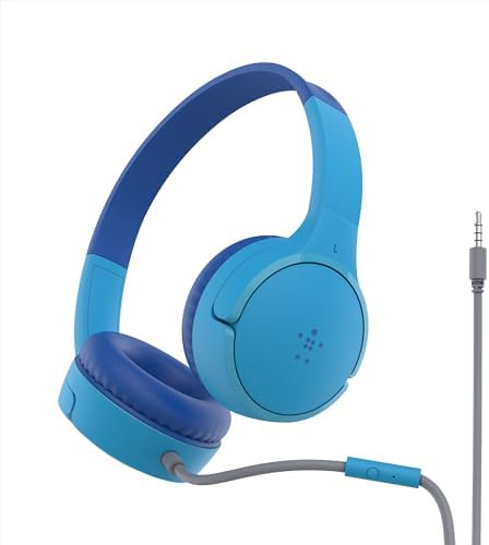 View full detailsBelkin SoundForm Mini Kids Wired Headphones with Built-in Microphone & Fun Stickers, 85dB Safe Volume Limit – for Online Learning, Travel, Compatible w/iPhone 15, iPad, Galaxy S23, & More - Blue