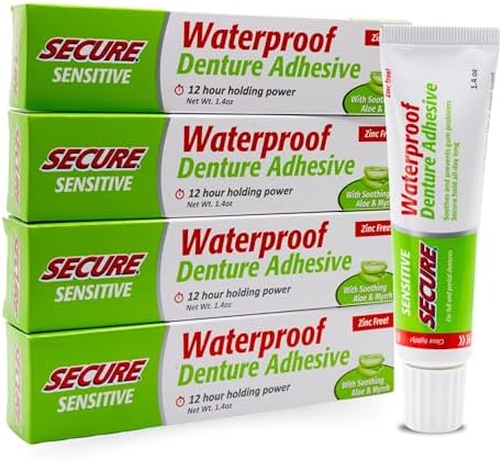 View full detailsSecure Sensitive Gums Waterproof Denture Adhesive Zinc Free with Aloe Vera & Myrrh - Extra Strong 12 Hour Hold - 1.4 oz (Pack of 4)