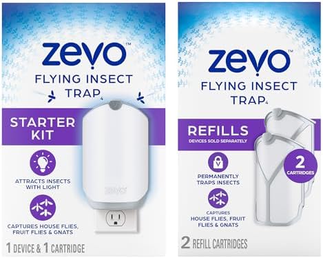 View full detailsZevo Flying Insect Trap for Indoors: Light Trap Captures Fruit Flies, Gnats and Houseflies, Starter Kit + Refills (1 Plug-in Base + 3 Cartridges)