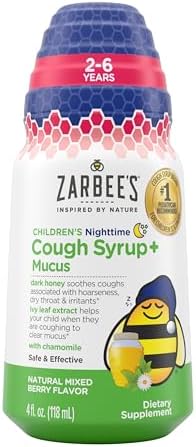 View full detailsZarbee's Kids Cough + Mucus Nighttime for Children 2-6 with Dark Honey, Ivy Leaf, Zinc & Elderberry, 1 Pediatrician Recommended, Drug & Alcohol-Free, Mixed Berry Flavor, 4FL Oz