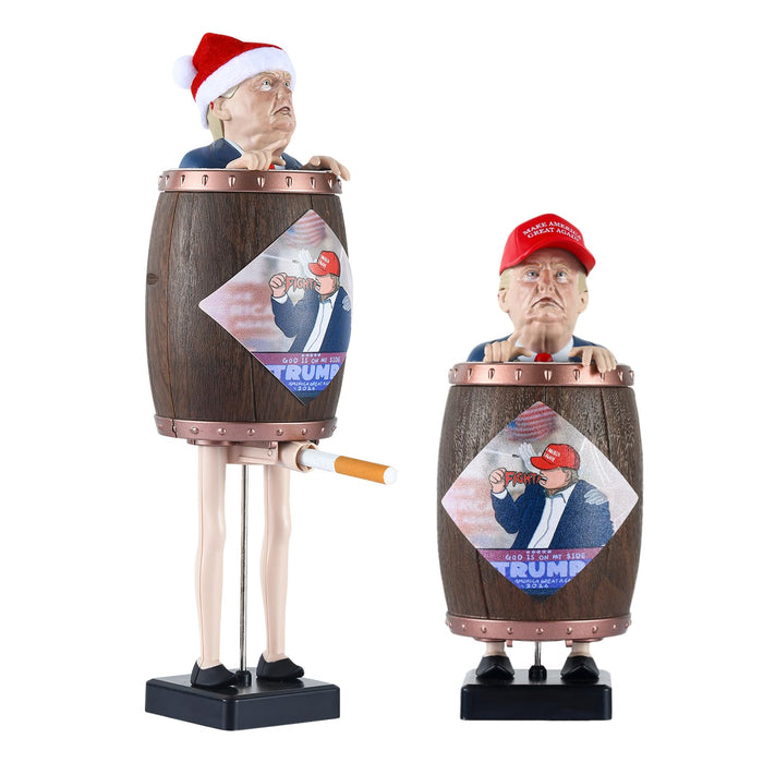 - TRUMP HAT REPLACEABLET: The trump stuff -- prank automatic cigarette dispenser adopts a sturdy bearing to provide double guarantee for the stability of long-term use, and is supplemented by a user-friendly adsorption function. The Donald Trump with hat in the wooden barrel figurines statue cigarette holder case comes with two hats (one is maga hats trump 2024, the other is Santa hat). So that you can always help the Trump sculpture change his hat to suit the needs of your scene
