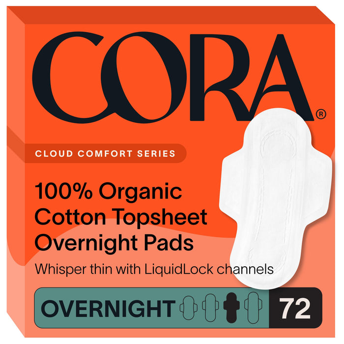 Details: Inspired by the women who wear them, this pad is smart, innovative and overachieving--and now made with 100% certified organic cotton [topsheet]. Pure and powerful, it's mind-blowingly thin yet powerfully absorbent, so you can live fearlessly during your period. Our patent-pending channel technology pulls liquid into the ultra-absorbent storage layer so you feel drier, longer. By combining this technology with yogi-flexible, breathable organic cotton, we've created an entirely new generation of pads that delivers maximum night-time leak protection and comfortably contours and moves with you through the night. We believe that what you use for your body matters, and you deserve the very best. That's why we've chosen a cashmere-soft, microspun organic cotton topsheet to naturally wick moisture away without any nasty chemicals or extras. Adhering to the highest standards, our products are always responsibly made without pesticides, insecticides, GMOs, fragrances or deodorants, dyes, chlorine bleach, polyester, phthalates or other scary ingredients. This product is made in the USA with renewable energy, too. Cora is on a mission to help every woman on the planet access safe and healthy period care. With every box purchased, Cora provides one month supply of menstrual pads and health education to girls in need, so they can confidently manage their periods and stay in school. To date, Cora has donated more than 3 million pads, helping more than 15,000 girls, globally. Join the movement and step into the future of womanhood.