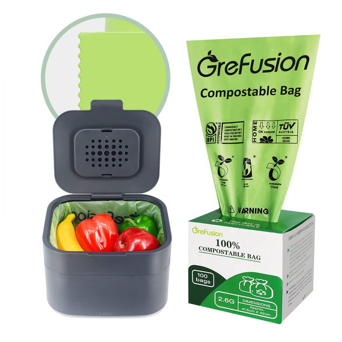 • 【SMALL COMPOST BAGS&UPDATE SUPER THICK 0.72 MIL】As GreFusion 2.6 gallon compostable bags are able to withstand a heavy load of food scraps without any ripping ,We are Proud of update the design of food Waste bags thick with 0.72 Mils for carry food waste and coffee grounds well,sturdy enough with less chance of perforation by sharp leaves to avoid create a mess in compost bin.These bin bags are strength enough to save amount of compostable item and keep trash can clean.