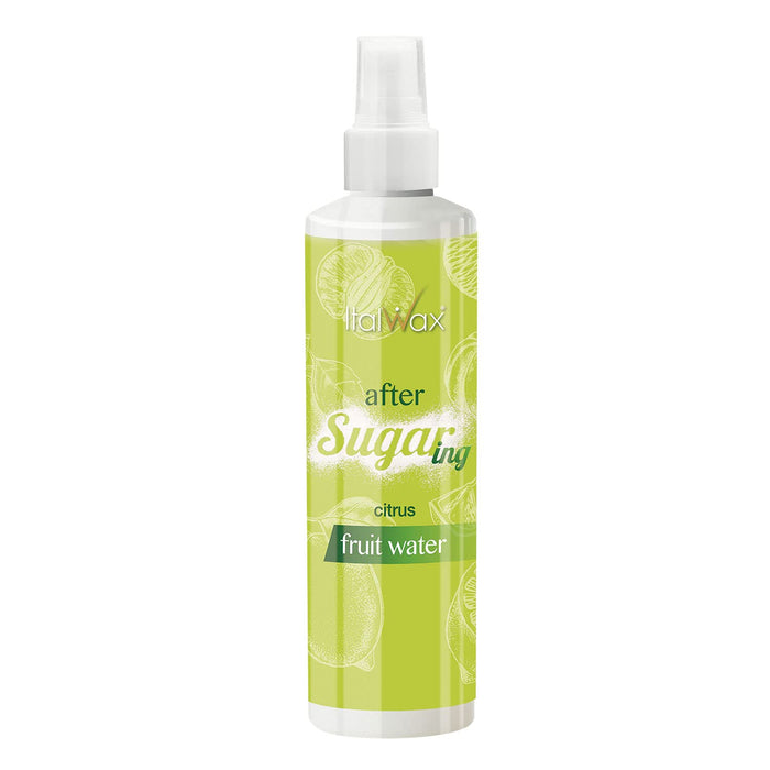 ITALWAX AFTER SUGARING CITRUS FRUIT WATER Fruit water is made on the basis of citrus fruit extracts, rich in essential oils. Cosmetic water instantly soothes and moisturizes the skin, eliminating irritation after epilation with cooling and revitalising effect. The aroma of citrus fruits has a beneficial effect on the body, it creates an upbeat mood, and embodies positive vibes. “Citrus” fruit water gives a charge of freshness and vivacity. Product form: 250ml. Directions: Apply to the skin after sugaring treatment with light massage movements until complete removal of the sugar paste residues. Storage conditions: Store in a cool, dry place and away from direct light. See detailed instructions on the package. Made in Italy