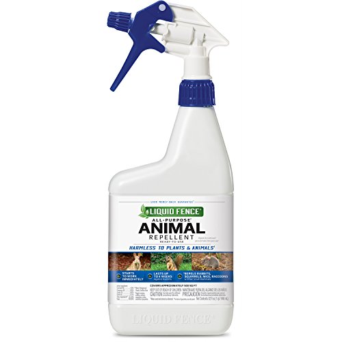 Details: Don’t let animals have the pick of the garden before you can. Deer, rabbits, moles and other four-legged pests enjoy your lawn and landscape as much as you do – hit them in the nose so they won’t come back. Liquid Fence animal repellents use scent- and taste-deterring formulas that won’t harm animals or plants when used as directed. Invisible barrier. Clear results. Liquid Fence all-purpose animal repellent ready-to-use creates an invisible barrier against animals like rabbits, squirrels, mice and other small mammals. This rain-resistant formula starts to work immediately, and it’s safe to use around pets, kids and wildlife, when used and stored as directed. This product repels rabbits up to 4 weeks and is safe to use around edible plants, when used and stored as directed. Apply in your yard, landscape and garden. Spray evenly around the treatment area and reapply as needed. In areas where animal activity is intense, additional and/or heavier applications may be needed. When applying to edibles, thoroughly wash crops before eating; for leafy vegetables, remove and discard the outer layer of leaves and rinse thoroughly. See product label for complete directions for use.