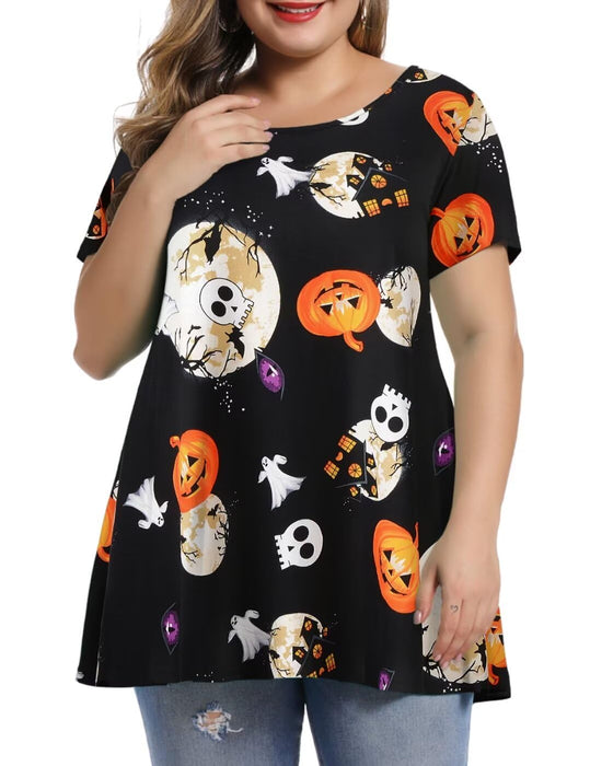 MONNURO Womens Halloween Shirts Short Sleeve Casual Loose Fit Flare Swing Plus Size Tunic Tops(Halloween-black,4X)