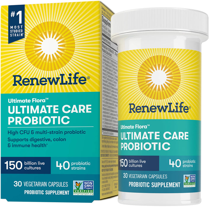 Details: Renew Life Ultimate Flora Ultimate Care Probiotic is a high CFU, multi-strain formula that provides immune support with the #1 Dr. Preferred Probiotic Strain for Respiratory Health.** * The improved formula has more clinically studied strains than the leading brand to support digestive, immune and colon health.* Each capsule has 150 billion cultures from 40 strains, including the #1 most studied strain.*** Non-GMO Project Verified; gluten free; potency, quality and purity guaranteed. Made in the USA using only the highest quality global ingredients. DISCLAIMERS: *These statements have not been evaluated by the Food and Drug Administration. This product is not intended to diagnose, treat, cure, or prevent any disease; **Based on 2018 IQVIA ProVoice Survey of Primary Care Physicians who preferred HOWARU probiotic strain B. lactis Bl-04 for Respiratory Health after review of select clinical studies; ***L. rhamnosus GG strain, PubMed Clinical Trials