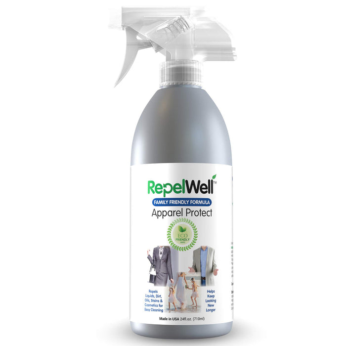 Ultimate stain prevention. Go ahead and let your toddler play in the dirt. Drink red wine in your favorite dress! RepelWell Apparel Protect shields clothing from dirt, stains, and spills, makes them easier to clean, and keep them looking new, longer! This family & pet-safe water-based formula sprays on clear and is safe to spray on any fabric, even delicate suede and silk. It repels liquids, dirt, oils, stains, cosmetics, juice, wine, coffee, tea and more without changing the color, texture or breathability of the fabric. Stain and spill protection lasts through multiple washings, for up to 24 months, gently protecting your family's wardrobe.