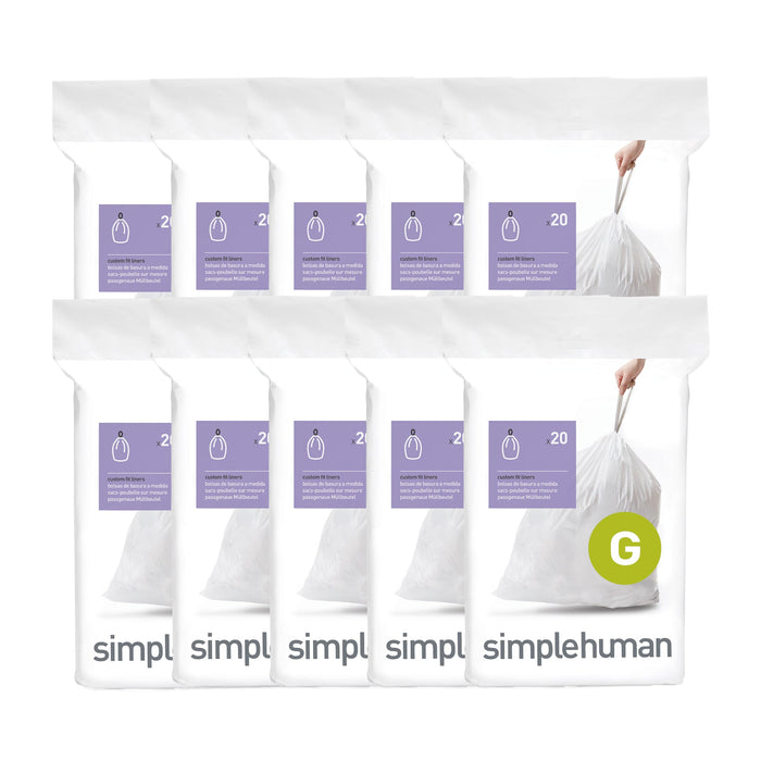 simplehuman Code G 200 Count,Genuine Custom Fit Liners, Drawstring Trash Bags in Dispenser Packs, 30 Liter / 8 Gallon, White