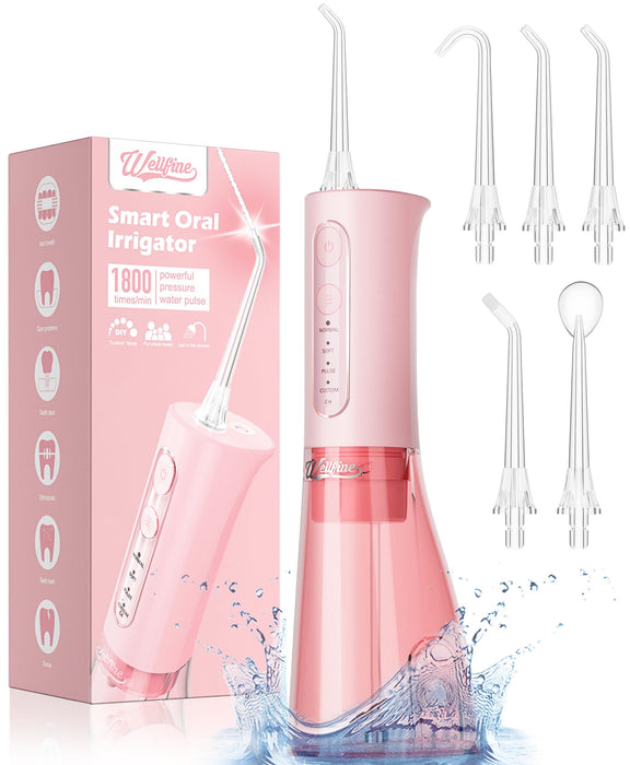 Details: WELLFINE unique ''Custom'' ModePress on mode button with 3s (do not release), the LED light flash. thewater pressure increased one level(level 18) with every press, when release the mode button, the relatedwater pressure will be selected.360 degree Water Jet TipsDesigned with 360rotating nozzle, can fully and clean all corner of your oral area.IPX7 WaterproofIpx7 waterproof design provides internal and external protection. It also allows you to use the oral irrigator safely to shower in the bathroom.If you're looking to upgrade your dental hygiene routine, you may want to consider using our WELLFINE water dental flosser.What you get:1 x WELLFINE 300ML Water Dental Flosser3 x Standard Jet Tip(Includes a curved nozzle)1 x Orthodontic Jet Tip1 x Tongue Scraper1 x Charging Cable(Adapter not included)1 x User Guide
